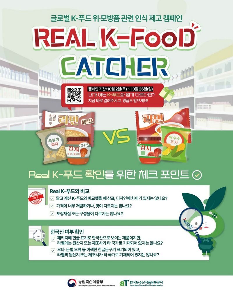캠페인 참여 방법: 포스터에 있는 QR코드 또는 http://www.kati.net/realkfood.do 접속 후 정품 K-푸드와 다르다고 생각되는 제품의 정보를 제보해 주세요.