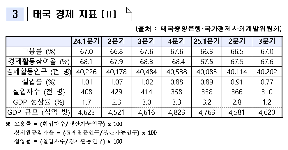 o 세계은행은 태국 경제성장률을 ‘25년 2.2%에 이어 ‘26년 1.6%로 전망함. 이는 기존 전망치 1.8% 대비 하향 조정된 수치로, 글로벌 교역 둔화, 높은 가계부채, 관광 회복 지연 등이 주요 요인으로 지목됨.
