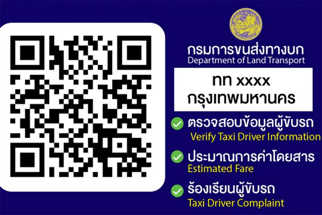 태국 육상교통국(DLT)에 따르면, 모든 미터 택시는 승객이 운전기사 정보를 확인하고, 요금을 예상하고, 서비스 만족도를 평가하고, 불만을 접수할 수 있는 세 개의 QR 코드를 의무적으로 부착해야 한다.