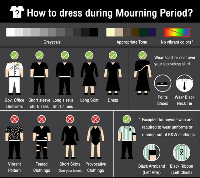 [2016년 푸미폰 국왕 서거때에 발표된 애도 의상 안내. 이번 시리킷 왕태후 애도 기간에 그대로 적용해도 될 것 같다]