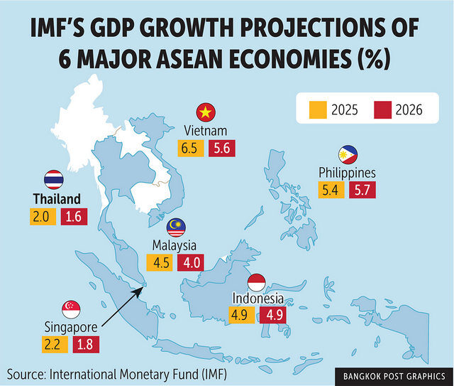 이 보고서에 따르면 태국의 올해 태국의 GDP 성장률을 2.0%, 2026년 GDP 성장률은 1.6%로 동남아시아국가연합(ASEAN) 10개 회원국 중 가장 낮았고, 일본(0.6%)에 이어 아시아에서 두 번째로 낮았다(1.6%). 태국의 GDP 성장률이 미얀마(3.0%), 라오스(2.5%), 캄보디아(4.0%)보다 훨씬 낮게 나타났다.