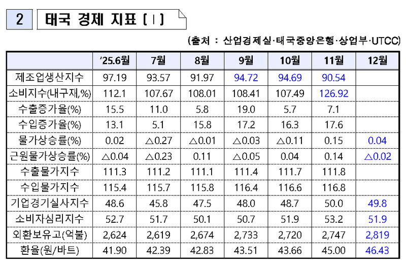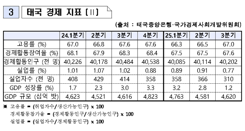 o 태국 상공은행연합(JSCCIB)은 ‘26년 GDP 성장률이 1.6~2.0% 수준에 그칠 것으로 전망하며, 국제 경제위기를 제외한 지난 30년 중 최약의 성장 가능성을 경고함. 이는 수출 부진, 높은 가계부채, 경쟁력 저하 등 구조적 취약성이 복합적으로 작용한 결과로 분석됨.